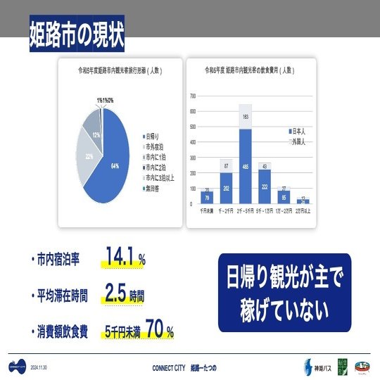 姫路市では駅西エリアをはじめとしたエリアリノベーションの取り組みが活発であり数多くのプレイヤーと新たな事業が立ち上がっています。リノベーションスクール等の効果により、駅西のスモールエリア内に2年間で13件の新規事業が立ち上がるムーブメントが起きています。一方、姫路市全体で考えると姫路城を中心に数多くの観光客が訪れているものの、平均滞在時間が極端に短い課題があります。