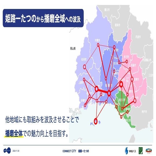また、今回は3つの企業がそれぞれのエリアでの活動実績や強みを掛け合わせられることができたため、まずはたつのと姫路からスタートしていますが、この動きを播磨全域に波及させて播磨全体としての価値向上も目指していきます。ひいては、Connect Cityの取り組みを全国各地、都市をつなぐことによる価値向上が見込める地域に波及していくことが目標です。