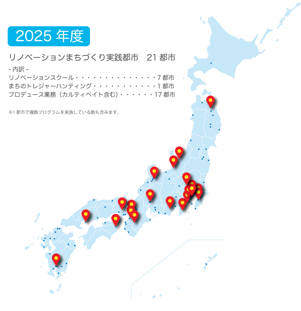 今年度リノベリングが伴走支援しているのは21都市。全国各地で、リノベーションスクールやカルティベイトプログラムなど様々なプログラムが実践されています。