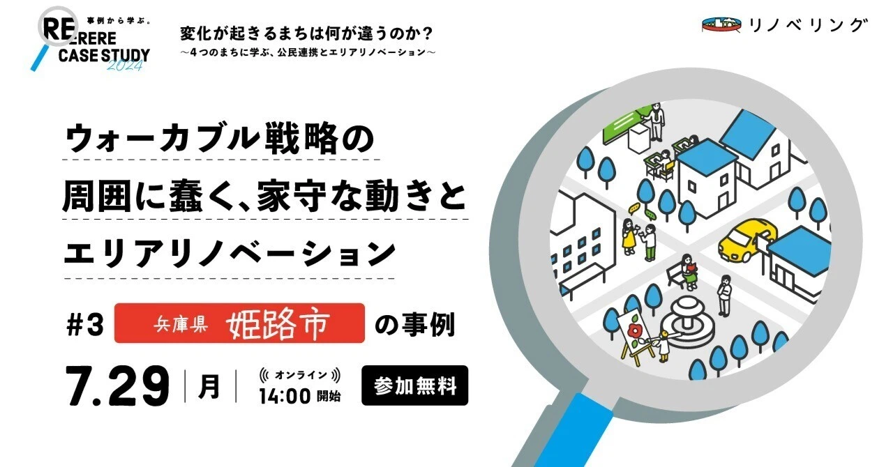 2024年8月28日 【開催レポート】「ウォーカブル戦略を支える、2つの家守のエリアリノベーション」〜4つのまちに学ぶ、公民連携とエリアリノベーション【兵庫県姫路市】の事例〜 エリアビジョン リノベーションスクール 事例紹介 企業連携 家守 姫路市