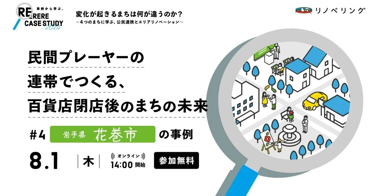 2024年9月5日 【開催レポート】「民間プレーヤーの連帯でつくる、百貨店閉店後のまちの未来」〜4つのまちに学ぶ、公民連携とエリアリノベーション【岩手県花巻市】の事例〜 リノベーションスクール 事例紹介 家守 構想 花巻市