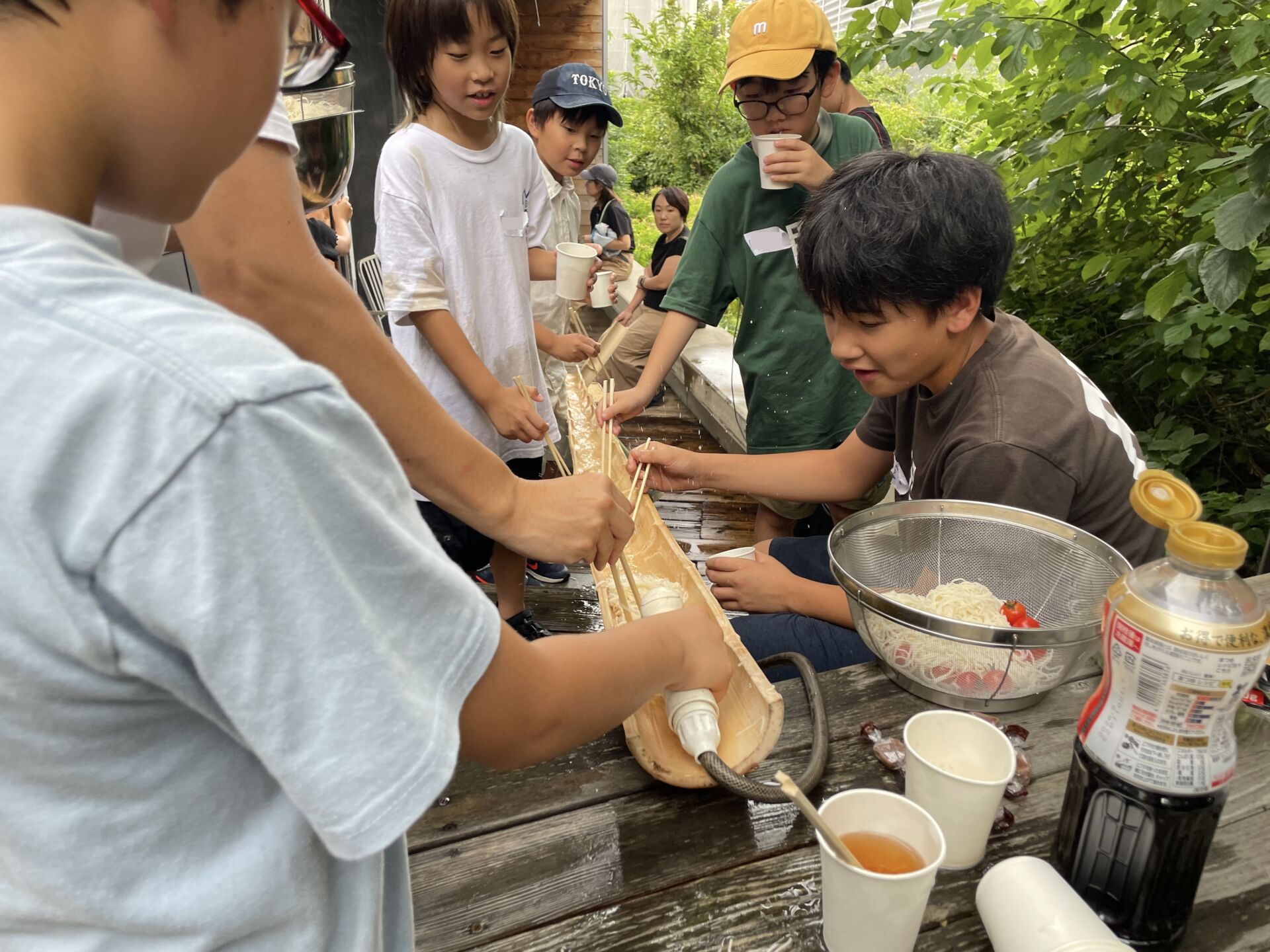 オーナーの「地域にもっと開かれた場所にしたい」という思いにふれ、子どもたちもこの場所でやってみたいことを企画することに。みんなで話し合い決定したのは、近所の動物も巻き込んだ流しそうめんパーティー。「どうしたらみんなが集まるかな?」と頭を悩ませながら、自分たちでチラシを作って配布したり、またたびで猫を誘き寄せたり…ご近所さんの暖かい協力も得ながらパーティーを実現させ、地域の方も一緒に楽しい時間を過ごしました。