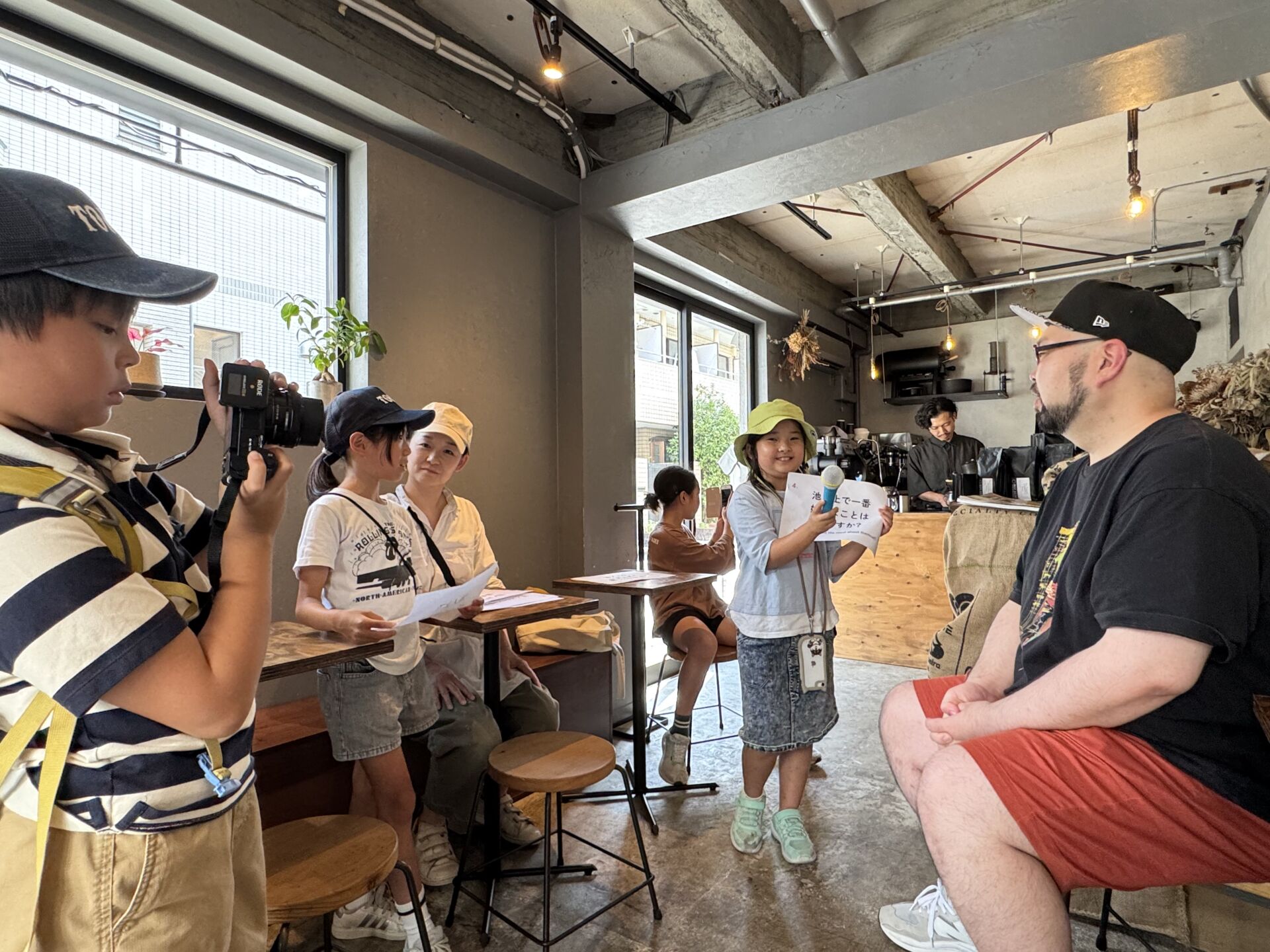 子どもたちはお店で茶道と書道を実際に体験しながら、「インバウンドの外国人の方に、池ノ上の魅力、和文化体験の楽しさをもっと知ってもらうには?」という店主からの問いを考えました。さらに地域で暮らす方々にインタビューをしながら、池ノ上の知らなかった魅力を自分たちの言葉で見つけ出し、その体験をもとに池ノ上の魅力を紹介する映像を制作しました。