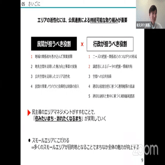 エリアの活性化は行政だけ、民間だけでなしえるものではなく、公民がお互いの役割を遂行しながら持続的に取り組むことが重要です。まず行政がエリア活性化を仕掛ける際には事業化することから始まると思われがちですが、そこにニーズや活性化のキーマンを見い出せないまま事業が進むと尻すぼみになり、事業終了と同時になかったことになりかねません。そのため事業化するためにはまずニーズの把握や関係者との繋がりの形成から始め、課題の理解を深めることが重要です。また、民間事業者では難しい統計的なデータを把握しオープンデータとして公開するなど定量的な情報を共有することで民間事業者サイドから課題を探る際のソースを提供することも重要です。一方、民間事業者は住民を含めた地域の関係者を巻き込んだ事業展開を始めることが重要な一歩となります。それぞれ足元を固めた上で段階的に役割をこなしていって民間事業者や住民等の民側がまちの理想像を描き行政と共に実現することで民主主導のエリアマネジメントが進み、住みたいまち、訪れたくなるまちが実現していきます。
